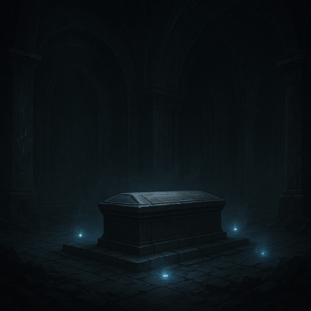 Stella raised her lantern high, its light revealing more of the circular chamber. The walls were lined with alcoves, each one containing a stone sarcophagus covered in intricate carvings. In the center of the room stood a raised dais, upon which rested a single sarcophagus, larger and more ornate than the others.